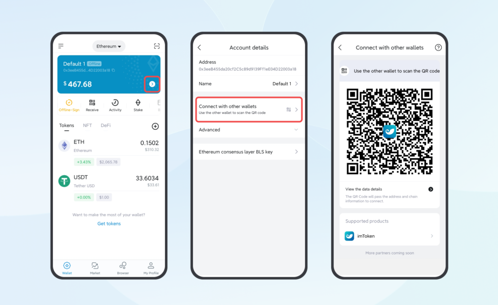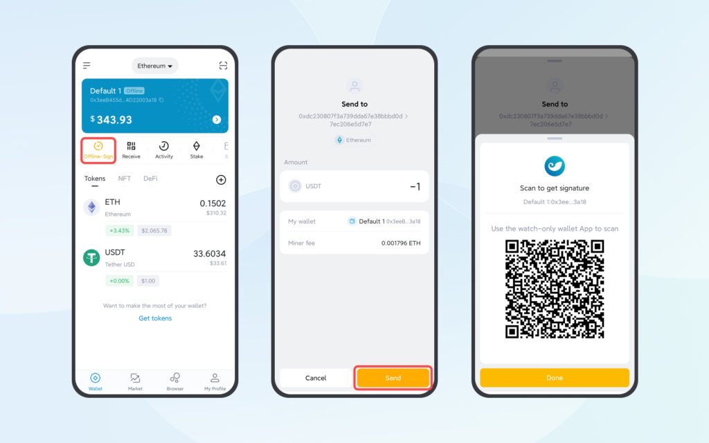 2. Access your new “hardware wallet” and in imToken, select the “Offline Signing” option, scan the QR code displayed on the screen of the other device, verify that the transaction details are correct, and tap Send. A new QR code containing the signed transaction will be displayed.
