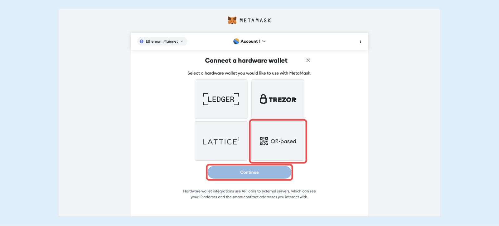 1. Start the operation you want to perform in Metamask from your daily-use device, selecting the account you set up earlier. A QR code will be displayed.