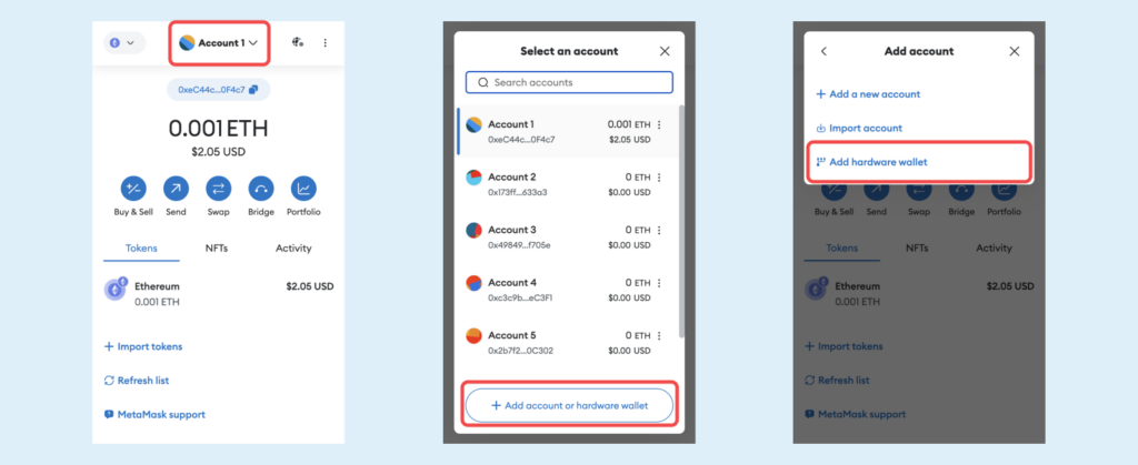 5. From the other device, go to Metamask. Open the menu to select an account and, at the bottom, you will see a button that says “Add account or hardware wallet.” Tap it. Then select “Add a hardware wallet.”