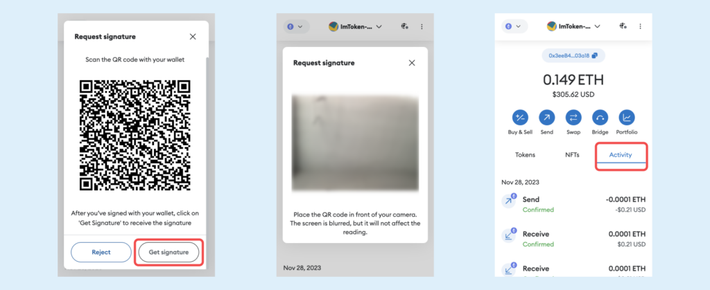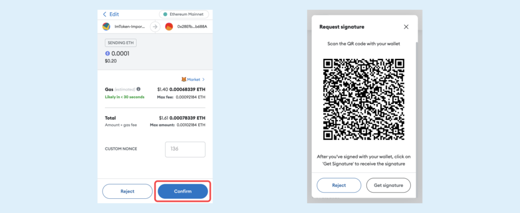 3. Return to the first device and continue with the previously started transaction; in Metamask, click on the “Get signatures” option. The device’s camera will activate, and you should scan the QR code generated by imToken on the signing device’s screen.